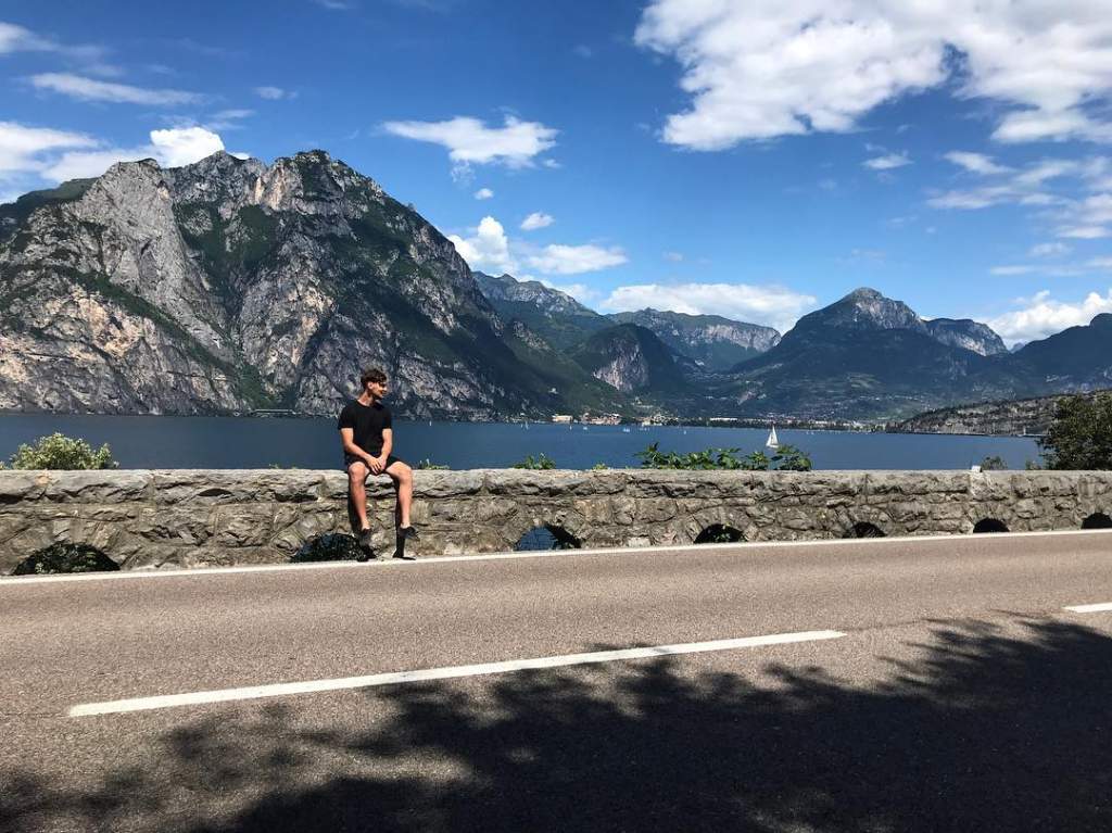 Mladý muž Petr Vacek sedí na kamenné zídce u silnice a hledí na jezero Garda s majestátními horami v pozadí za slunečného dne s bílými mraky.