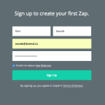 - Založení účtu na Zapier.com – účet je zdarma, a tak nemusíte nic řešit. Na stránce v pravém horním rohu kliknete na Sign Up a vyplníte registrační formulář.