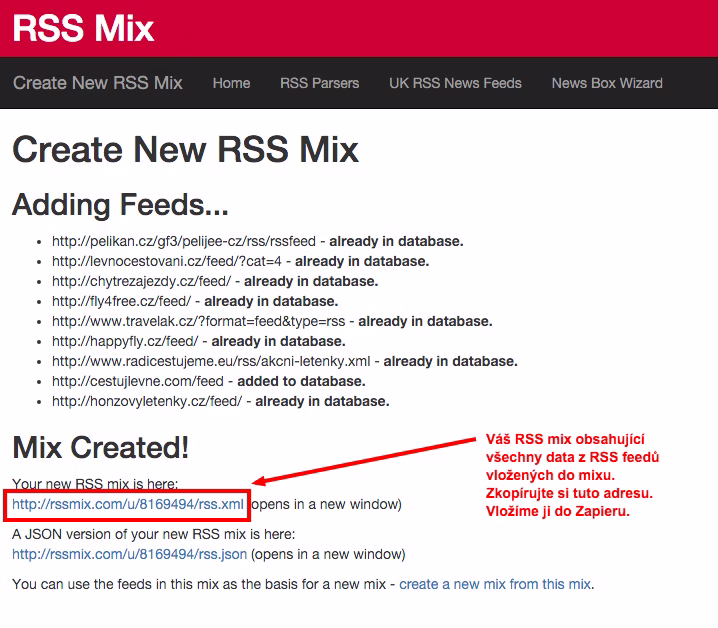 - Jak vidíte v aplikaci, Zapier umožňuje načítat data pouze z jediného RSS feedu. My jich ale máme desítky. Co s tím? Potřebujeme všechny dostat do jediného. K tomu nám poslouží jiná aplikace, která dokáže vybrané RSS feedy namixovat do jediného. Jmenuje se příhodně RSS MIX a najdete ji na adrese rssmix.com. Otevřete si ji v novém okně. Zde do textového pole vložíte všechny RSS adresy, které chcete promixovat. My jich pro ilustraci máme pár. Následně si svůj mix pojmenujete a kliknete na “Create!” Získáte url adresu RSS feedu, který obsahuje všechny RSS feedy, které jste do mixu nasypali. Viz obrázky.