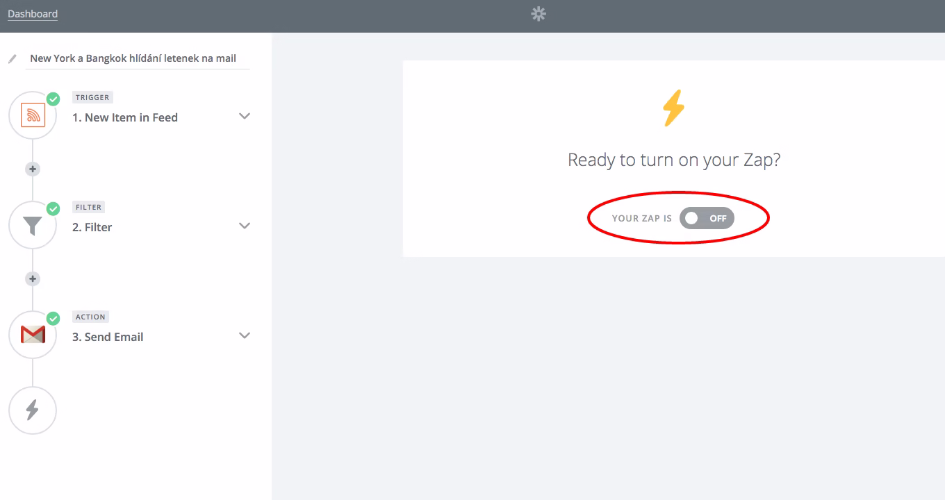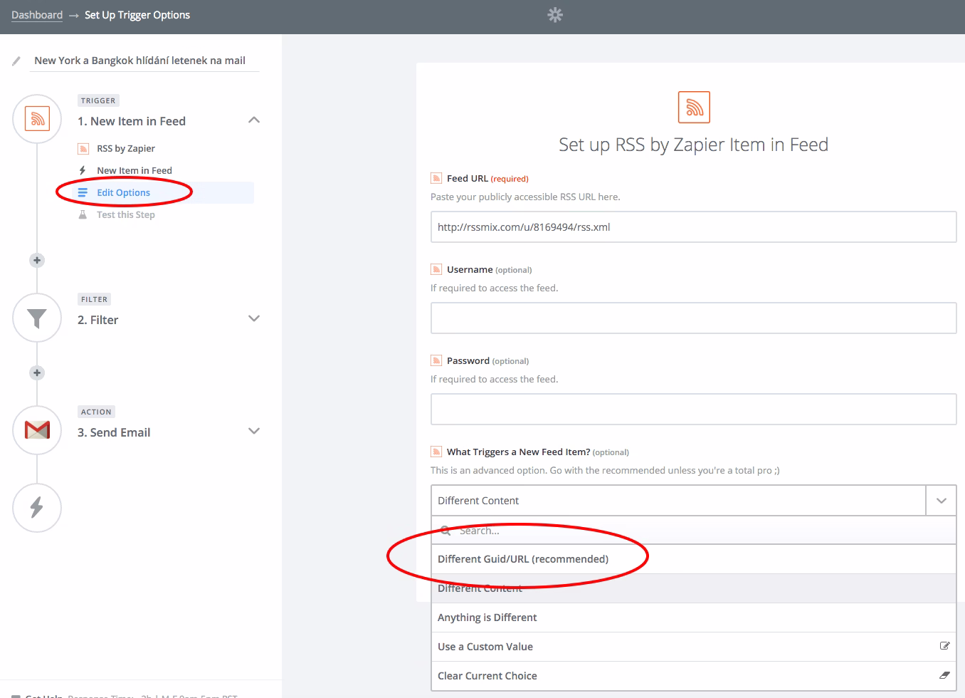 - Nyní přichází důležitý dodatek, bez kterého to celé nebude fungovat. Po vytvoření Zapu a uložení se vraťte na nástěnku, kde svůj filtr uvidíte. Klikněte na šipečku vpravo a vyberte Edit. V části RSS skočte do Edit options a tam, uplně dole v poli “What triggers a new feed item” vyberte “Different Guid / URL”. To je velice důležité. Pak už jen svůj Zap znovu zapněte a jakmile se v RSS feedu objeví vaše destinace, přijde vám email s odkazem na danou akci / nabídku.